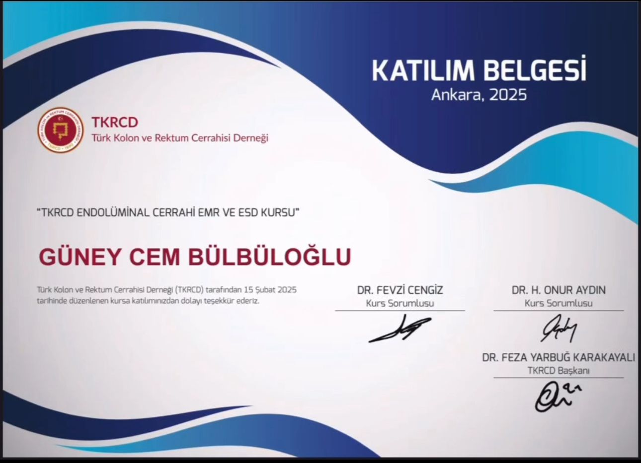 Gastrointestinal sistem hastalıklarının tanı ve tedavisinde endolüminal cerrahi yöntemler, modern genel cerrahinin en önemli gelişmeleri arasında yer almaktadır. Op. Dr. Güney Cem Bülbüloğlu, bu alandaki güncel yaklaşımları yakından takip ederek, Endoskopik Mukozal Rezeksiyon (EMR) ve Endoskopik Submukozal Diseksiyon (ESD) tekniklerine yönelik mesleki eğitimlerini sürdürmektedir.